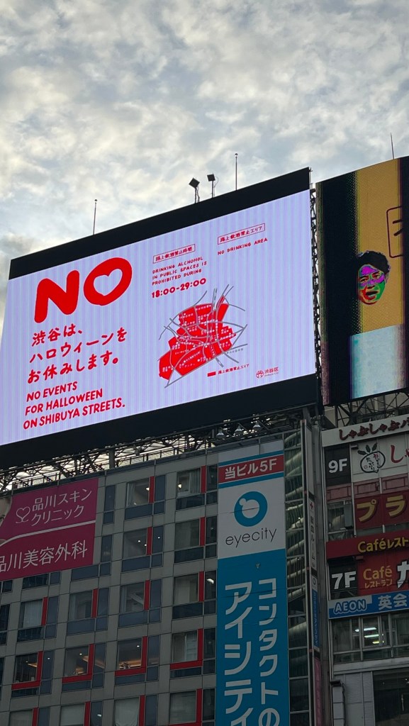 Once at Shibuya Crossing it was clear that the authorities wanted to avoid any unwanted Halloween celebrations and partying that has occurred in the area in the past and led to some disturbances. Instead there was a noticeable police presence and signs up all around advising that there would be no street parties or drinking in the area over the next few days.
