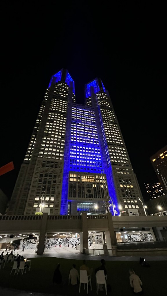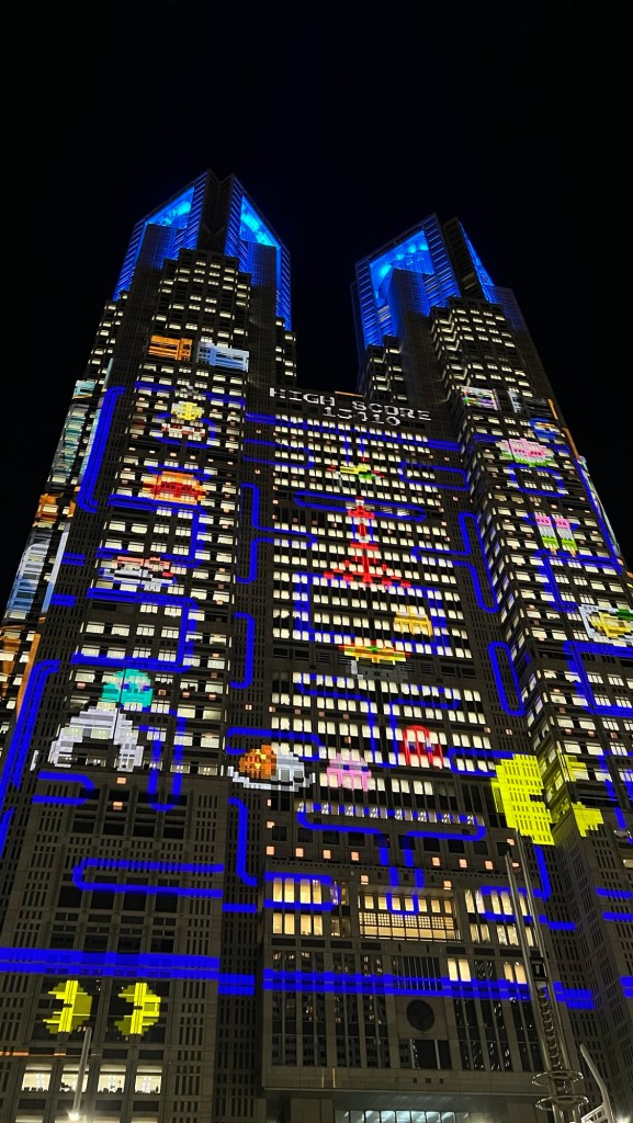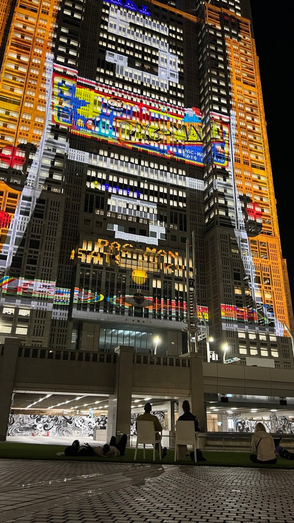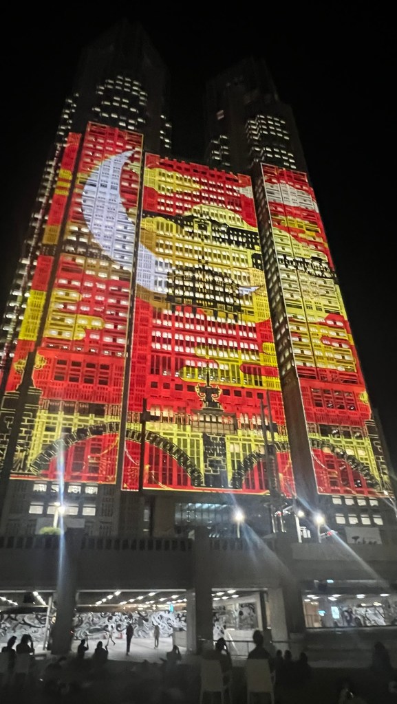This evening we had a walking tour with our guide Noriko with the starting point being a light show at the Tokyo Metropolitan Government Building. This happens each week night and was truly spectacular, beaming a whole range of Japanese themed images onto the front of the building.