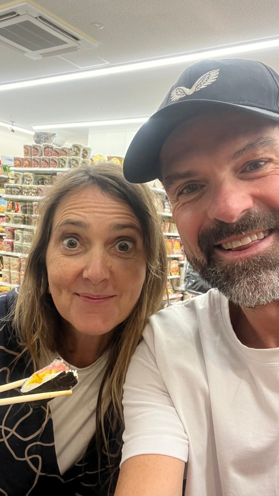 As the rain got heavier outside we made the decision to return by tube to the hotel and put off our Saturday night plans for a meal out for tomorrow. Instead we ‘dinned’ at Familymart, a 7eleven lookalike where we feasted on sushi and chicken katsu curry!
