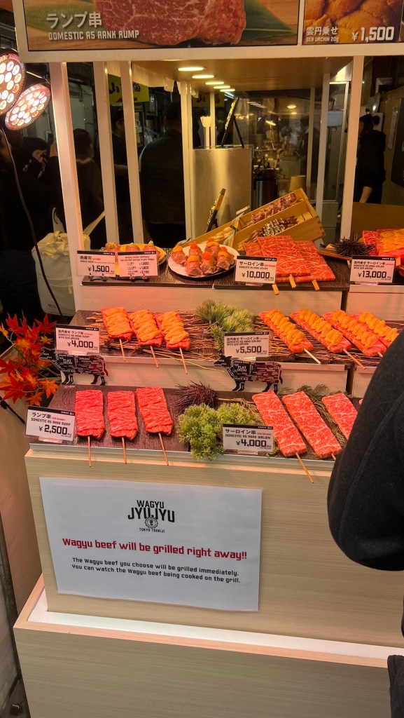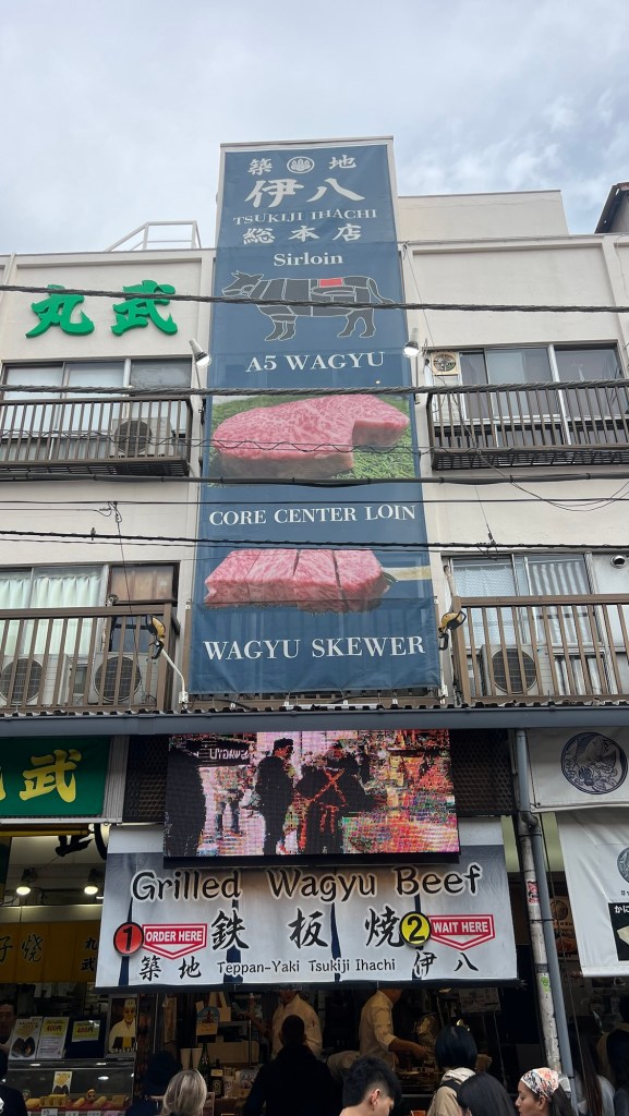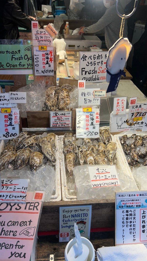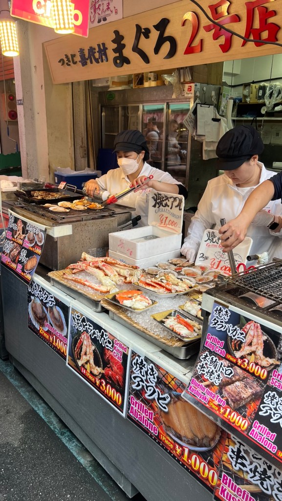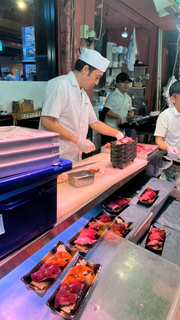 Our first early morning stop was a visit to Tsukiji fish market. While the inner market has moved to Toyosu, the outer market is still packed with stalls selling fresh seafood, snacks and produce. It’s a fantastic spot for seafood lovers with the most amazing array of sushi and all manner of fish and sea life!