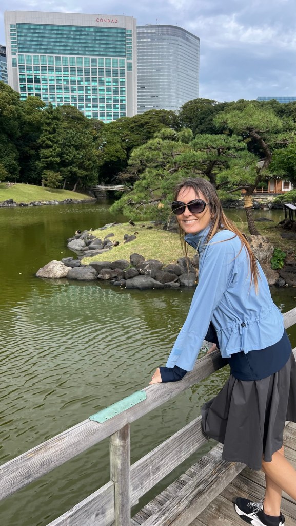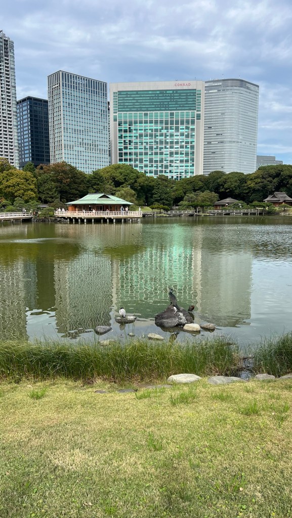 The traditionally styled garden stands in stark contrast to the skyscrapers of the adjacent Shiodome area.