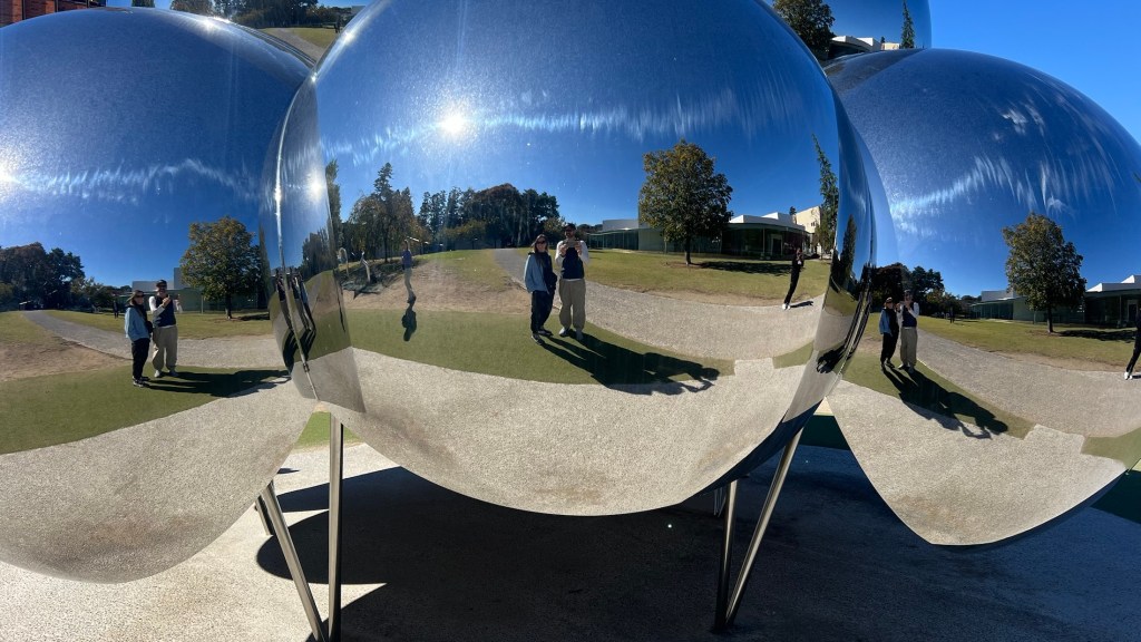 After an enlightening hour or so we decided to go and explore the art installations that sat outside the museum. With the return of the sunshine, this proved to be a more uplifting experience and seeing the large mirrored steel sphere it reminded us of the ‘bean’ we saw years ago on a visit to Chicago.
