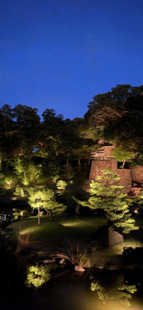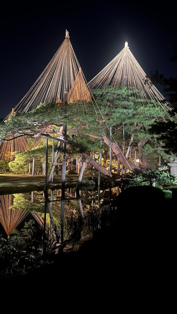 Around 5.45pm the sunset and the night shadows appeared alongside a magnificent light show illuminating the castle grounds and the adjoining Kenrokuen gardens. Both looked absolutely stunning and to our minds are the best we have seen in our time in Japan. Even if you’re not into gardens per se, you can’t help but be impressed with the scale and invention of what has been achieved in an artificial environment.