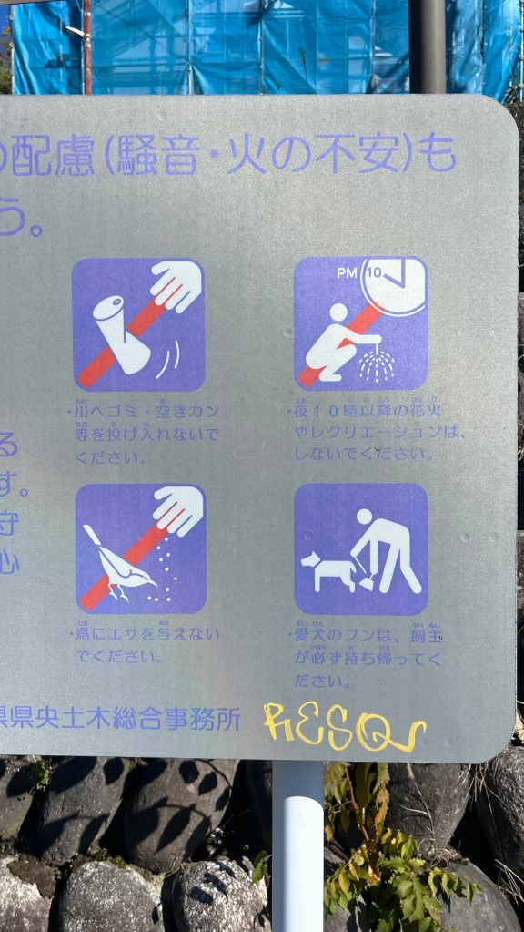 We decided to continue with our riverside walk and came across one of Japan’s infamous signs regarding the ‘do’s’ and ‘don’ts’ include random ones regarding not setting off fireworks after a certain time and not feeding the birds.