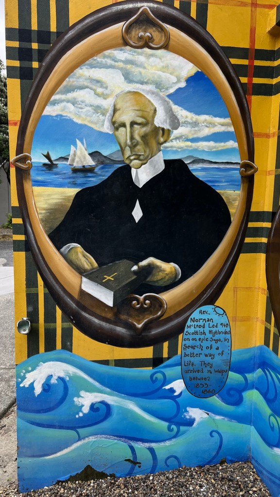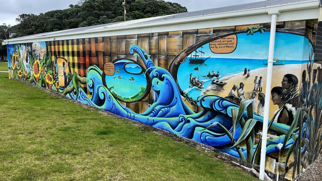 When we headed to Waipu Cove Beach, we found even more Scottish references with a large murial celebrating both the Scottish migration as well as the earlier arrival of Māoris to the area in the 13th century.