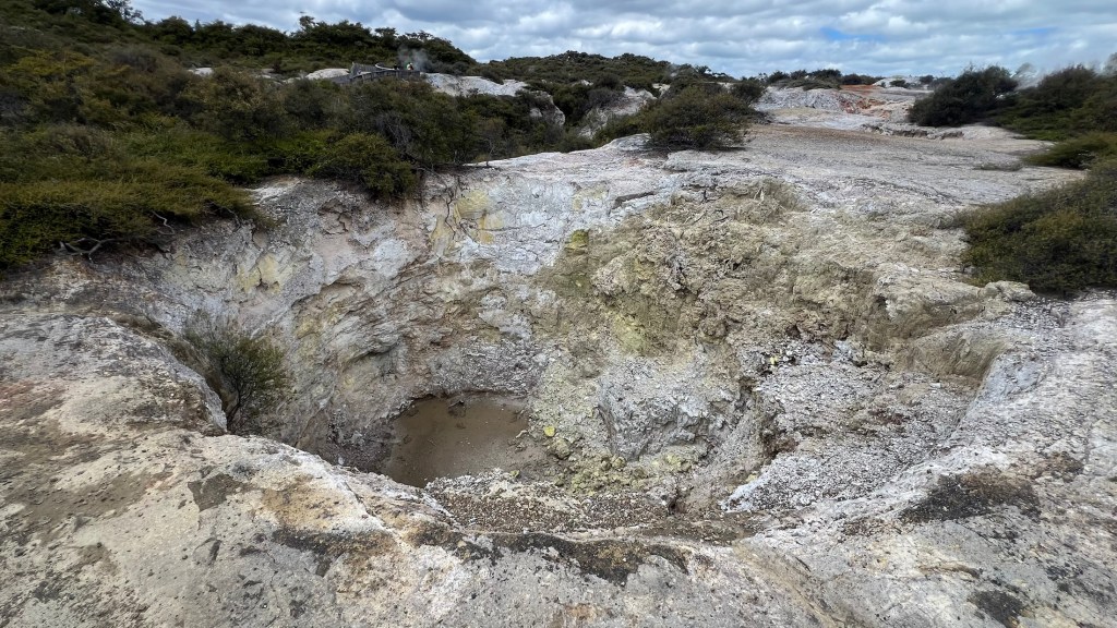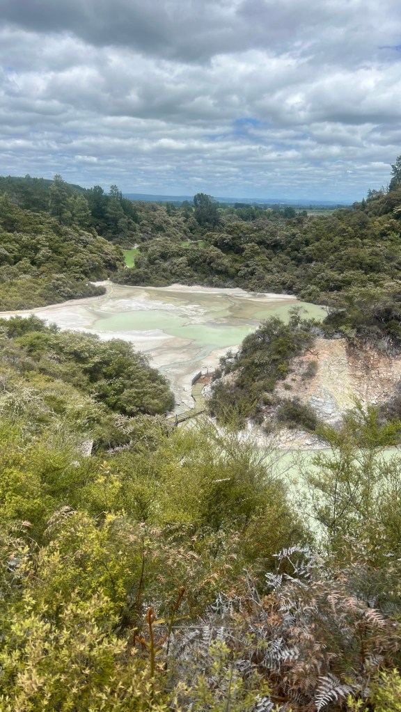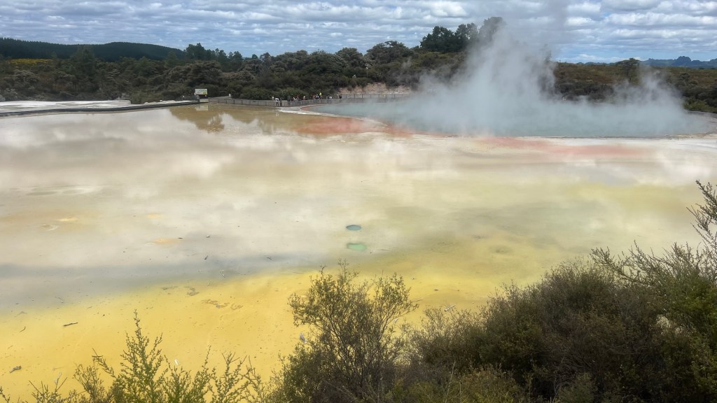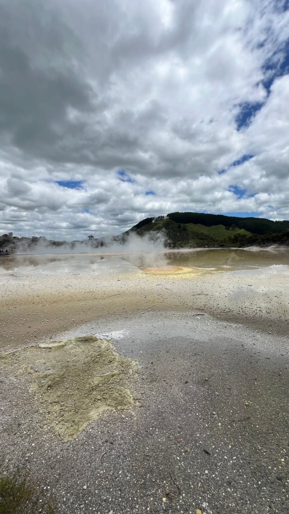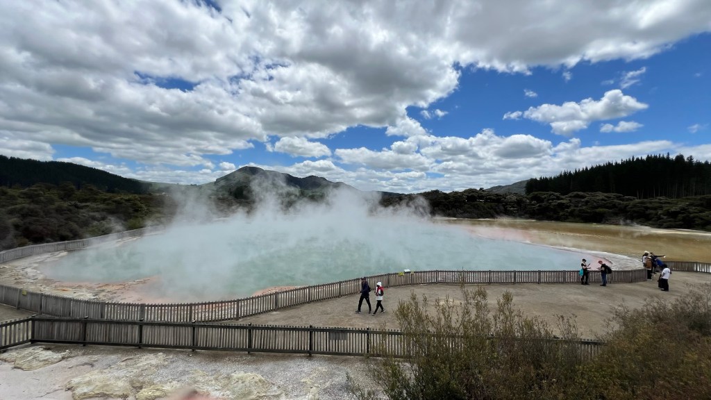 When we arrived in Rotorua we headed straight to Waiotapu Thermal Wonderland. The main attraction was the Lady Knox Geyser. It’s named after Lady Constance Knox, the second daughter of Uchter Knox, 15th Governor of New Zealand. The geyser is induced to erupt daily at 10:15 am by dropping a surfactant into the opening of the vent. Eruptions produce a jet of water reaching up to 20m and can last for over an hour, depending on the weather. Unfortunately we arrived at 11am so missed the star of the show and instead marvelled at the park area with several paths taking you around the various geothermal sites across a 5k route.