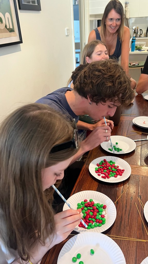 It was then the M&M game with straws to help move the chocolates from one bowl to the next.