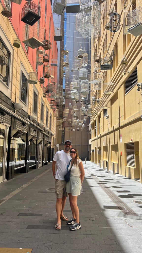 Located in Angel Place, just to the south of Martin Place, Forgotten Songs showcases 180 bird cages suspended above the street below. There are also bird species named in the pavement the visitor walks on. This piece has been on permanent display since way back in 2011.