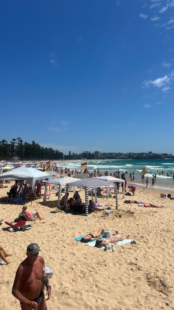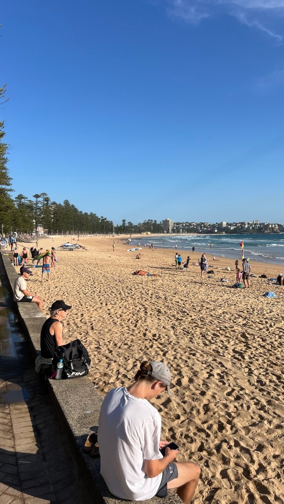After our caffeine fix we made our way to Shelly beach for what will be the last time for a while. Given the great weather and it being the last day of the holidays before people return to work on Monday, the sand and sea were both packed.