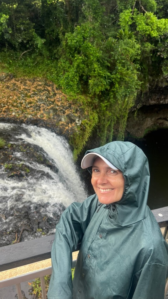 By the time we parked up at the falls, the rains returned and we were putting on our mack’s for the first time since being in Milford Sound in NZ.