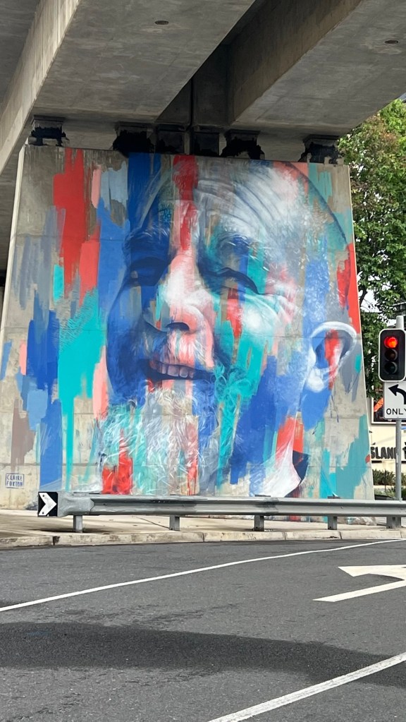 The city along the waterfront is a vibrant place and is adorned with colourful street art across the motorway bridges.