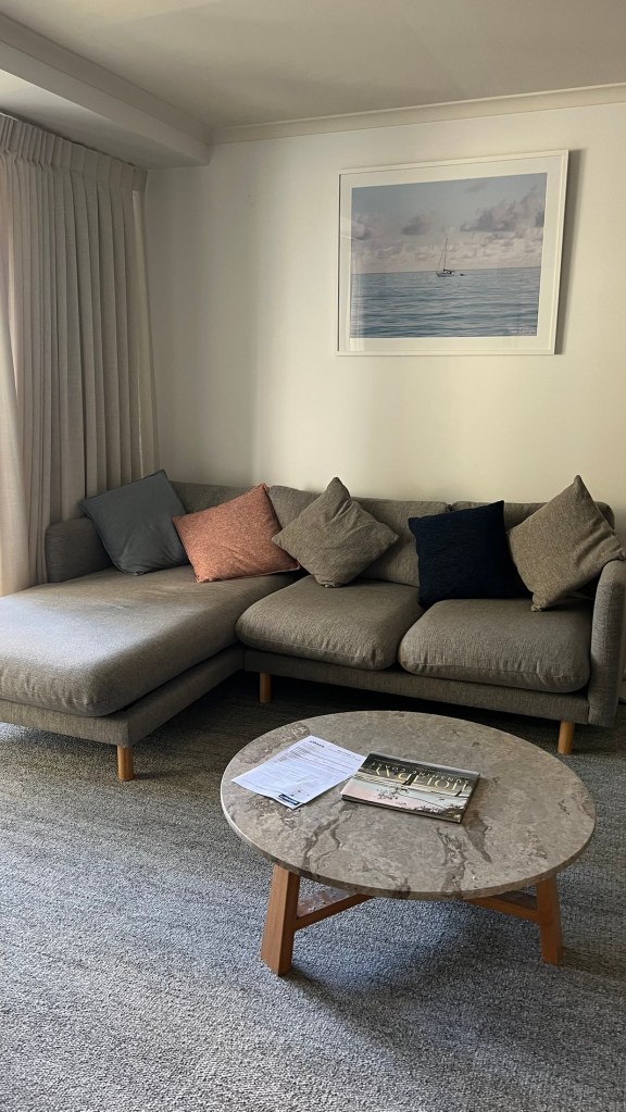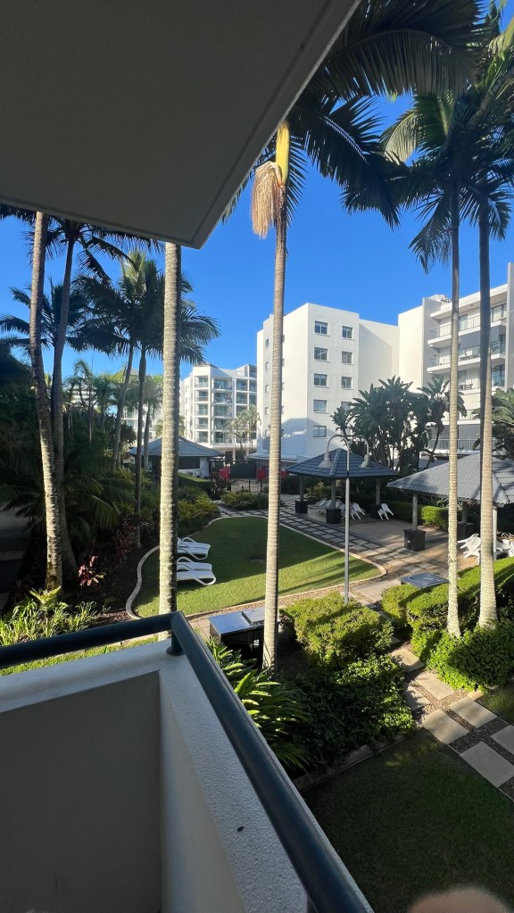 Tonight’s pad is at the Oaks Sunshine Coast Seaforth Resort, where we have a large open plan apartment with outside seating and a communal pool.