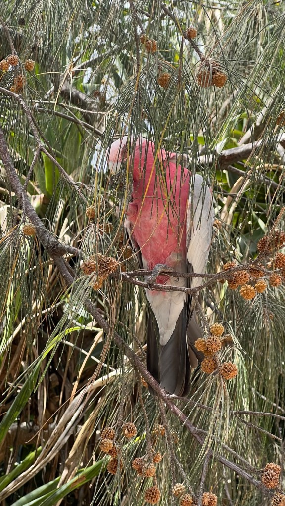 After checking out of our excellent apartment at the Oaks Sunshine Coast, we drove a few miles up the highway to Peregian Springs and on to Peregian Beach. As we walked across the car park to the beach walkway we came across a noisy parrot munching away on a trees berries. Such a beautiful and colourful creature.