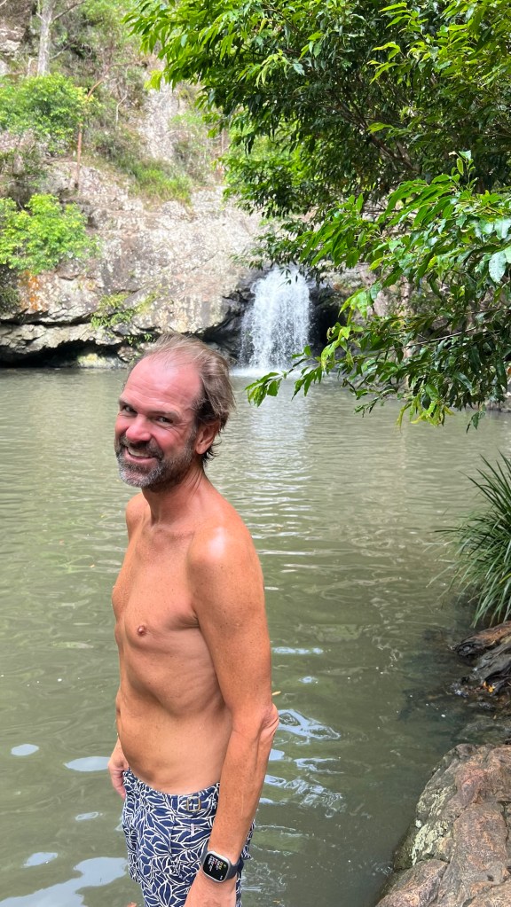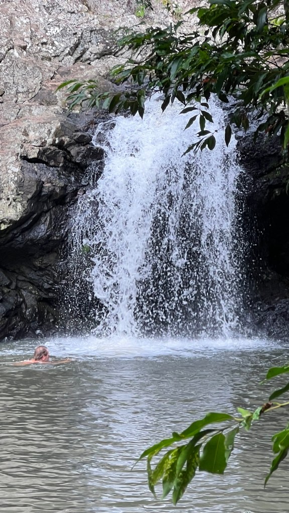 He managed to swim up to the waterfall and enjoyed the cool dip that helped to ease his aching muscles after his runs and walks earlier today.