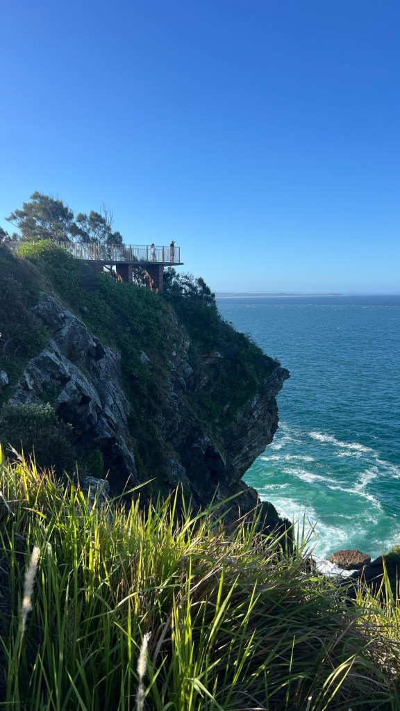 The viewing platform sits out above the rocky headlands giving visitors views south towards The Tanks, Pebbly Beach and the Forster Tuncurry breakwalls.