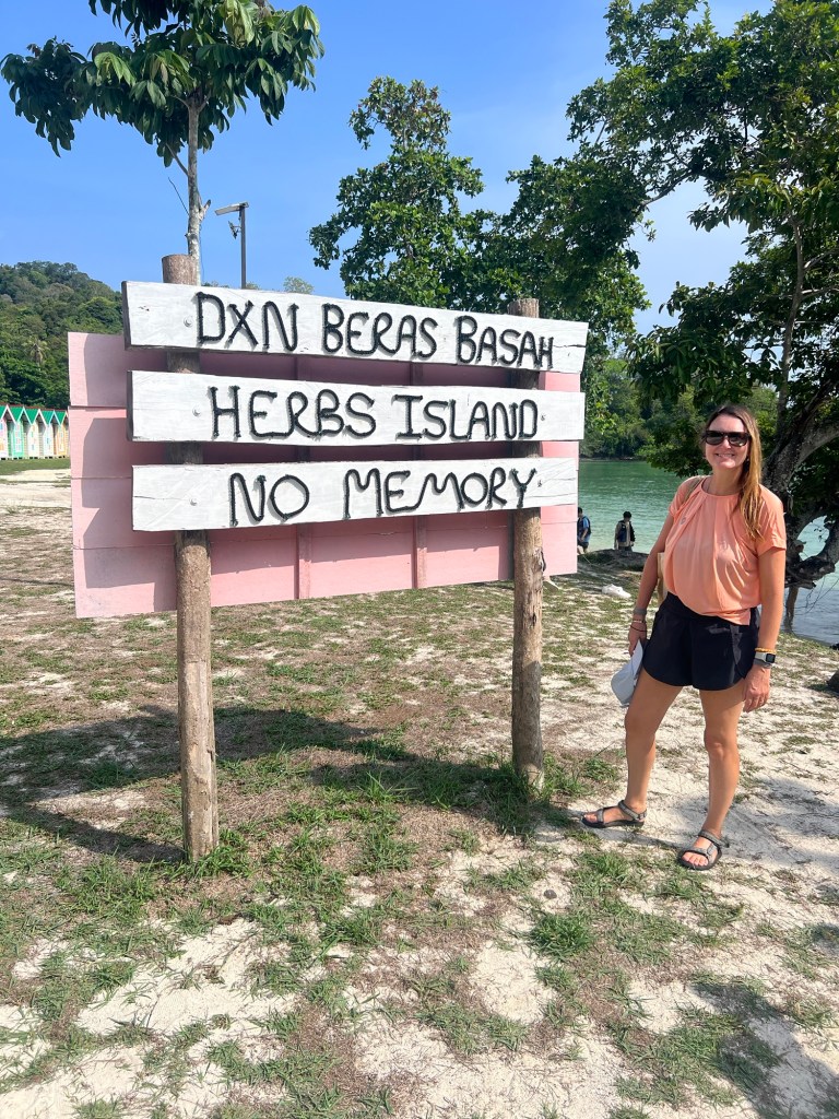 Once we reached land, it was white sandy beaches under palm trees, a proper island paradise. Being Malaysia there were a few witty signs (see below) and a row of colourful beach huts for changing in.