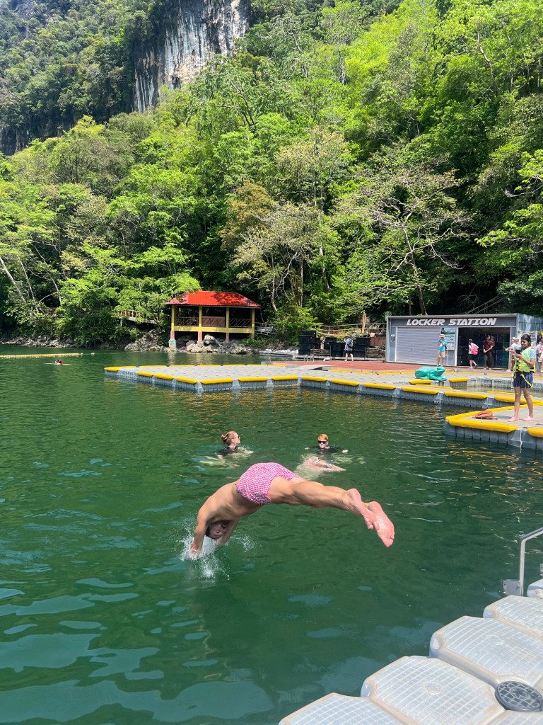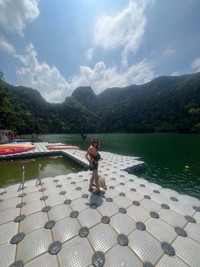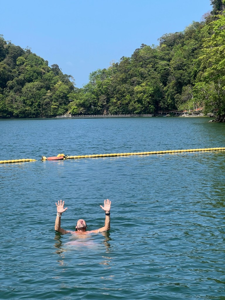 After descending some pretty steep steps we arrived on another floating jetty, this one a little more secure than the last. Without shade it was a hot place to be at midday so we quickly both jumped into the lake, which had been warmed by the sun and had hit a temp of 34c.
