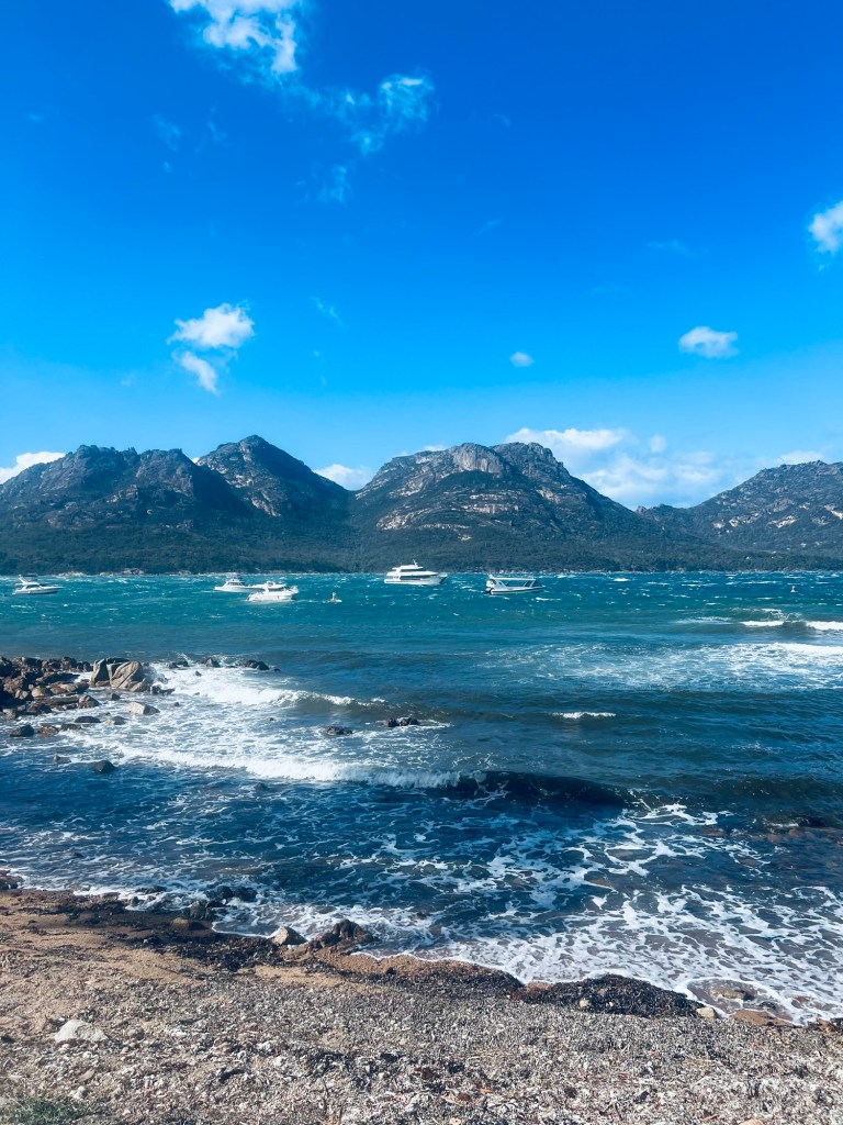 After a 45min drive from Swansea we arrived to a blustery Coles Bay and some serious waves and bobbing boats in the bay.