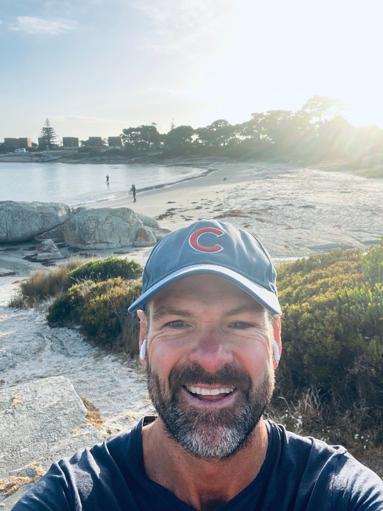 Morning run finished In Bicheno All quiet on Bicheno beach Room with a view to the beach