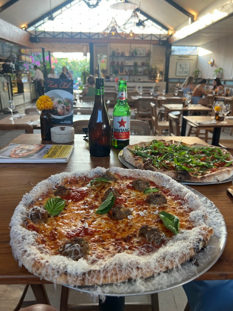 Like all the other dinning establishments in Bali, there are no walls, windows or doors, just a big open space and comfy seating, plus the all important 2 for 1 cocktail happy hours. So it was Pina colada and G&T’s all round!!